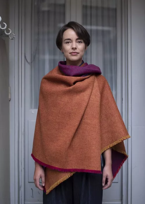 Schal PLUTO mit Fransen, Wollgemisch, grafisch gemustert in bordeaux/rost. Der Klassiker für kalte Tage (und Nächte…). CHF 125.-