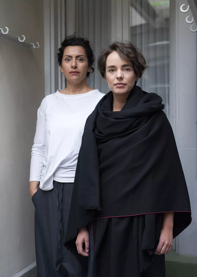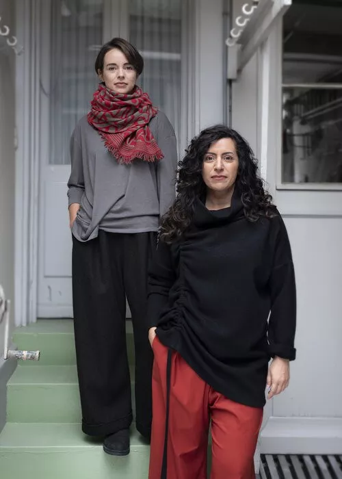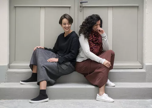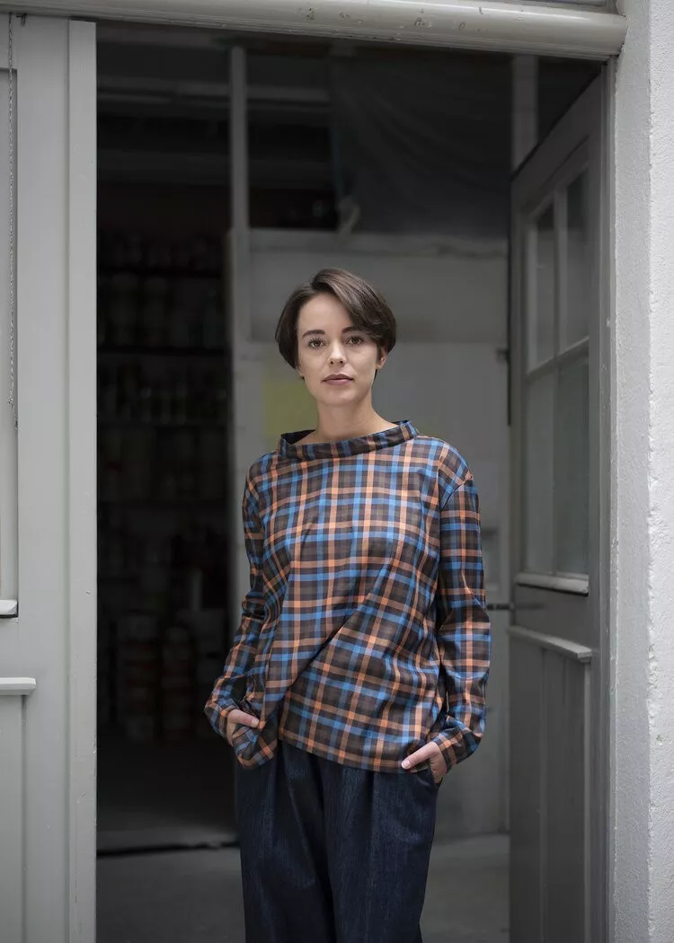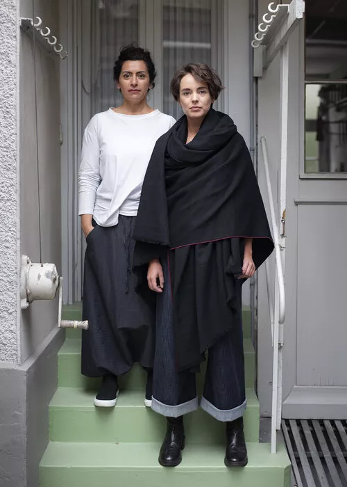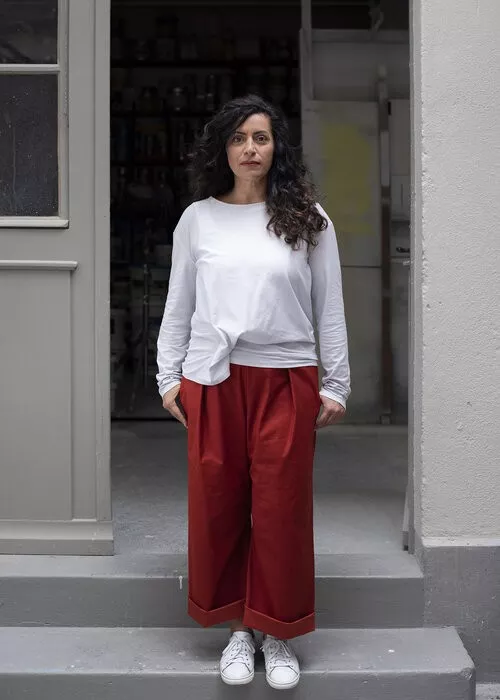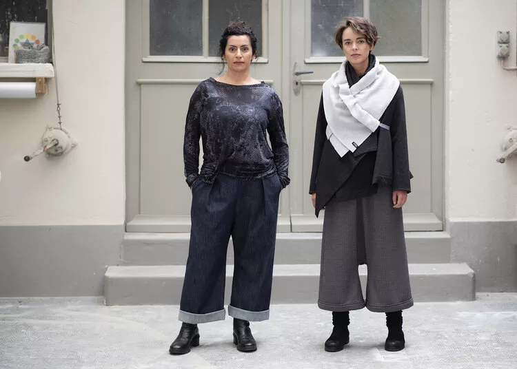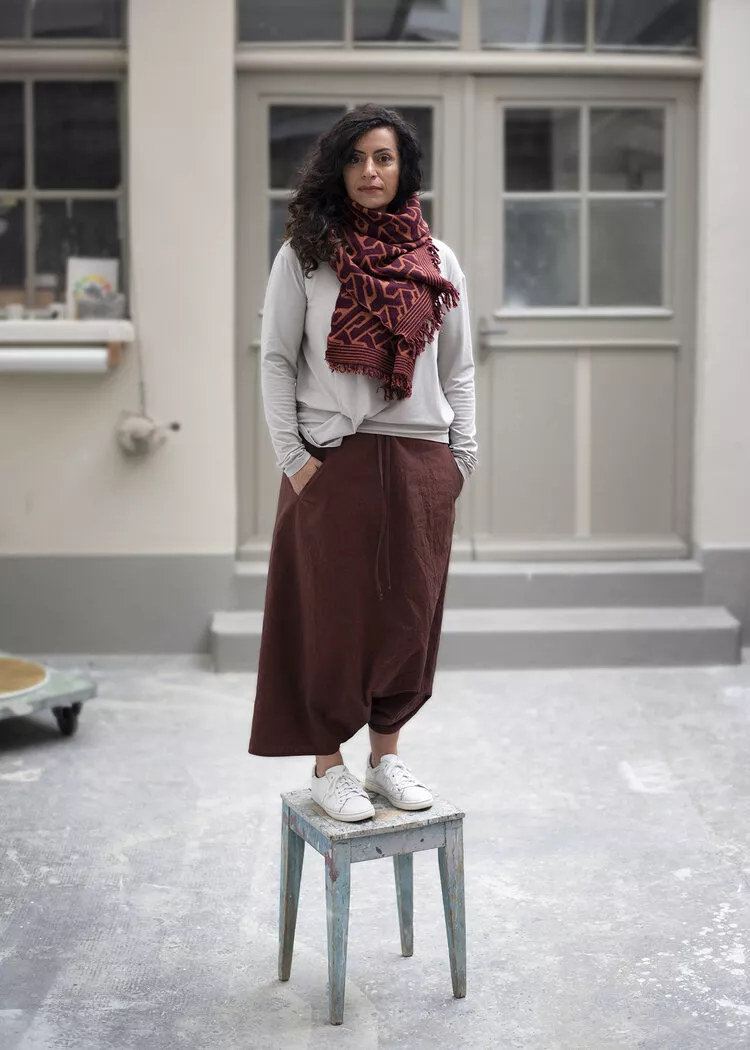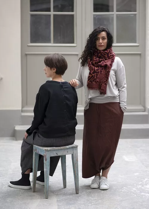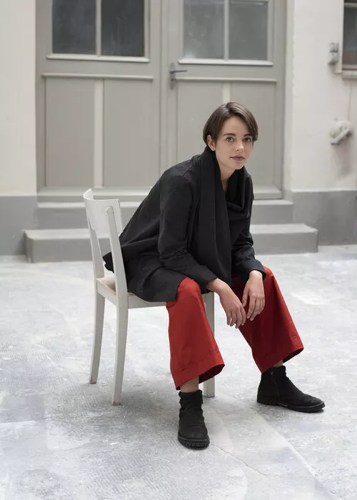 Hose FICHTE, Viskose-Woll-Gemisch, schwarz/ecru fischgrat. weite Tiefschritt-Hose, 3/4 Länge mit seitlichen Eingriffstaschen, Gummibund und breitem Hosenbeinumschlag. CHF 340.- (auch in anderen Farben & Materialien erhältlich).