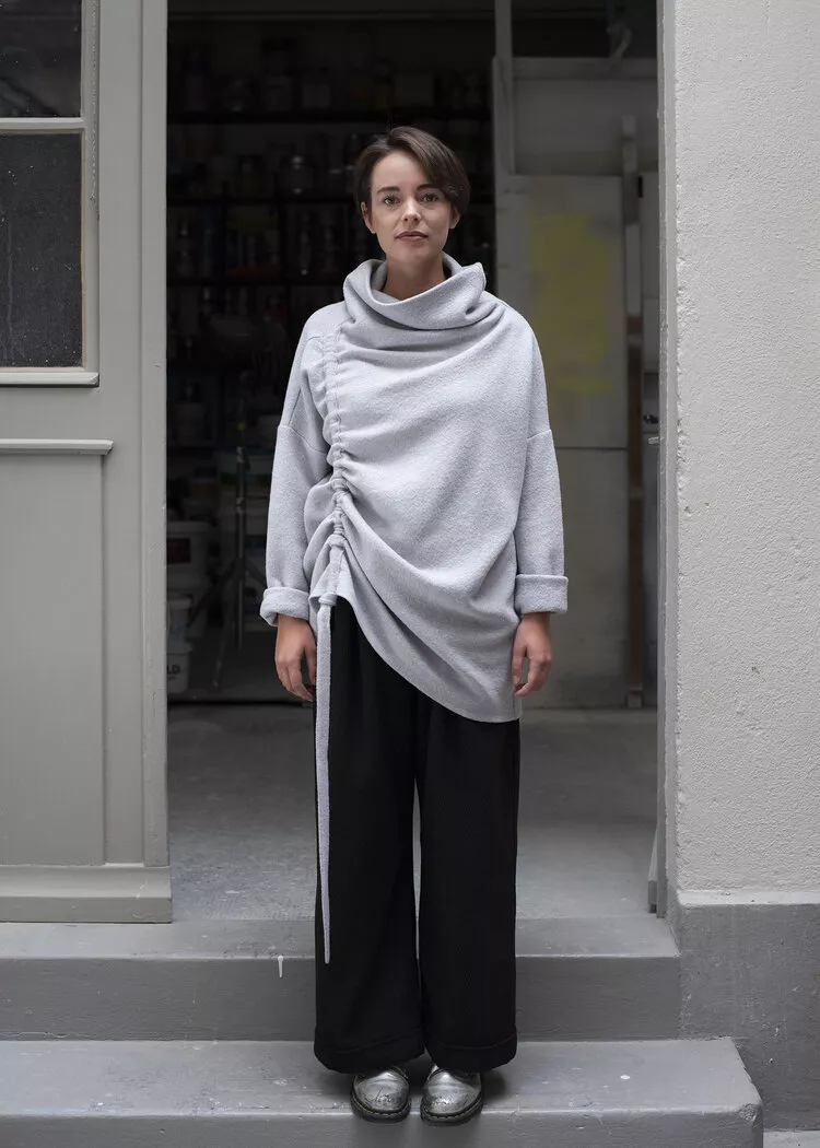 Oversize Pullover mit grossem Kragen und seitlichem Bindeband, kann lange oder gerafft getragen werden. CHF 379.-
