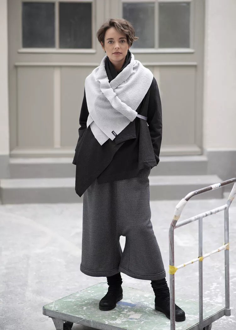 Schal RUFFLE, Merino-Walk, silbergrau (diverse Farben möglich). Dekorativer Schal, welcher mit einem Satin-Zugband auf die gewünschte Länge drappiert werden kann. CHF 145.-