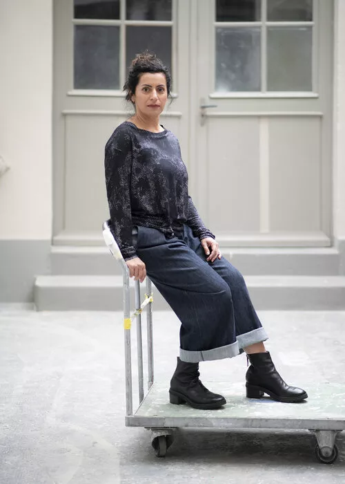 Shirt ESCHE LA, Wolle / Elastan, schwarz/hell gemustert. Shirt mit Rundhalsausschnitt und verdrehter Saumoptik vorne, überlange Ärmel. CHF 189.-