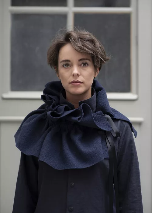 Pullover ZEDER, Merino-Walk, schwarz (in div. Farben bestellbar, auch aus Baumwollstrick in ecru erhältlich, CHF 249.-). Oversize Pullover mit grossem Kragen und seitlichem Bindeband, kann lange oder gerafft getragen werden. CHF 379.-