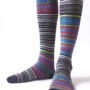 Dieser Kniestrumpf hat einen Barcode als Grundlage. Der «Millefeuille» hat im gleichen Streifen teils schwarz-weiss wirkende, teils multicolor-anthrazitfarbene Blöcke. Was im einen Socken neutral ist, ist im anderen bunt, also die Partien sind ausgetauscht. Am Fuss sind die beiden Socken sehr unterschiedlich.
