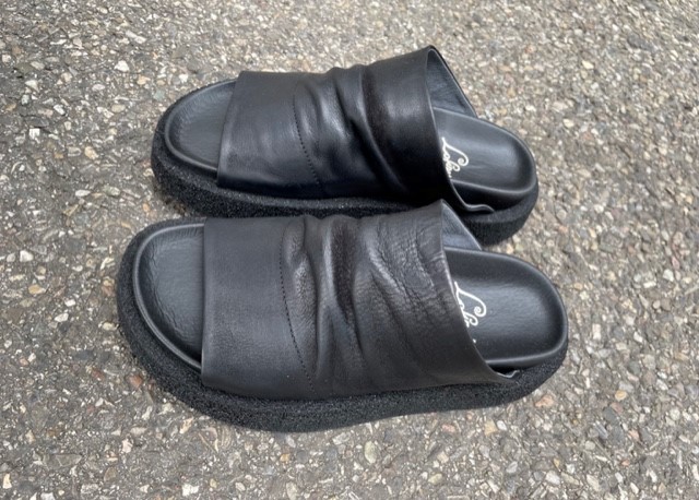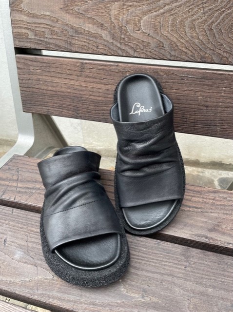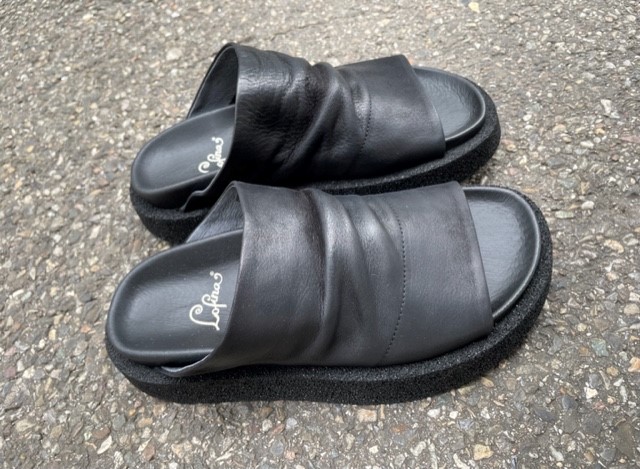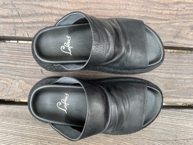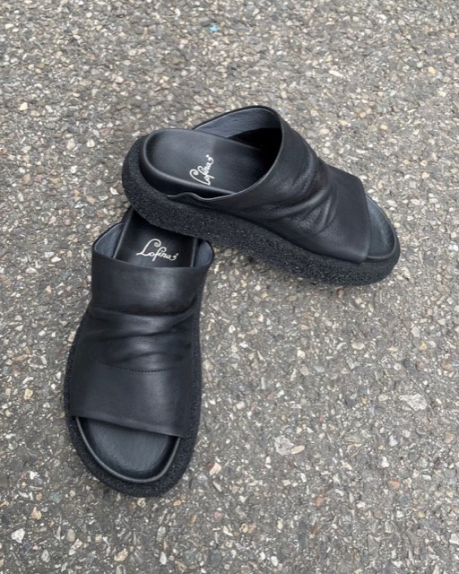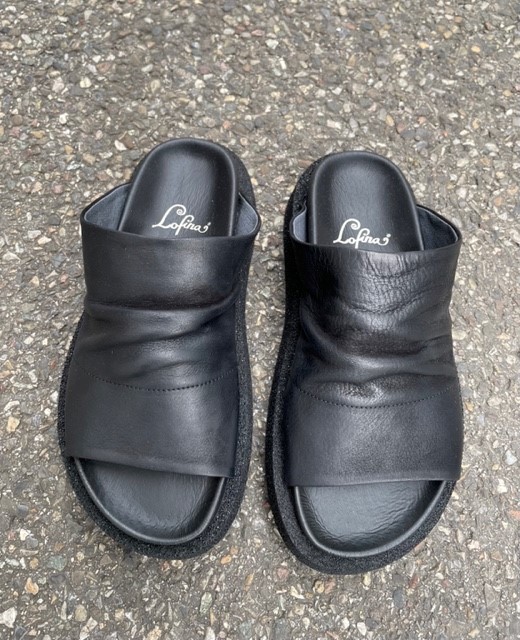 Diese neuen Lofina Sommersandalen sind da! Diese coole Schlüpf-Sandale ist aus weichem, schwarzen Leder (Gasoline) gefertigt, die breite und einfarbige Sohle ist aus Gummi. Ein Fussbett sorgt für den richtigen Halt und die Bequemlichkeit.